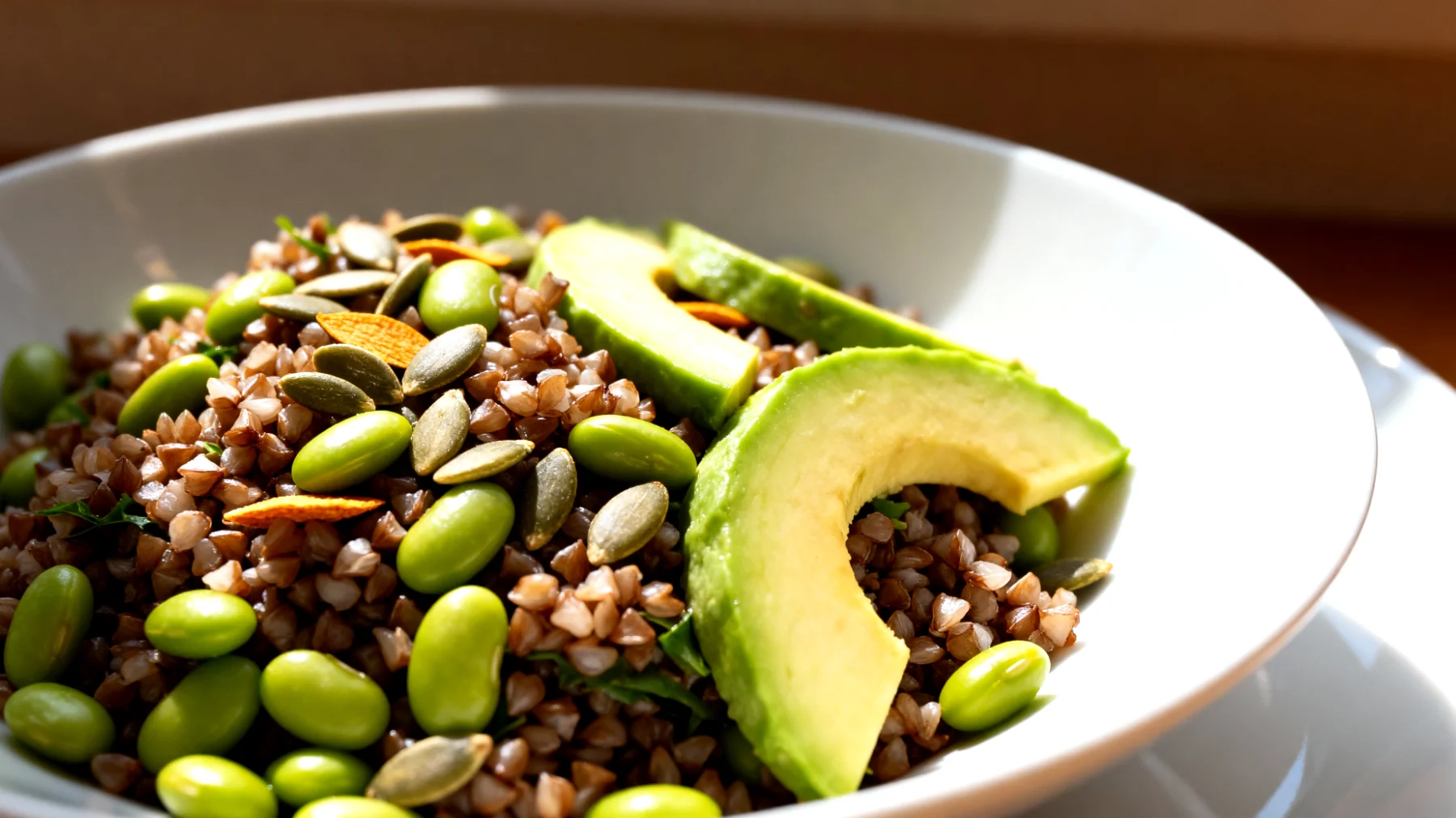Questa insalata rappresenta un esempio concreto di come comporre un piatto unico bilanciato secondo i principi della nutrizione moderna. La presenza simultanea di carboidrati complessi dal grano saraceno, proteine vegetali da edamame e semi di zucca, e grassi di qualità da avocado, semi e olio extravergine d’oliva è in linea con i modelli di piatto equilibrato proposti dalle principali istituzioni nutrizionali. Questo abbinamento favorisce un rilascio graduale di energia, limitando i picchi glicemici post-prandiali rispetto a un pasto ricco di soli carboidrati raffinati, e può aiutare a sostenere le performance cognitive e fisiche senza marcata sonnolenza post-prandiale.